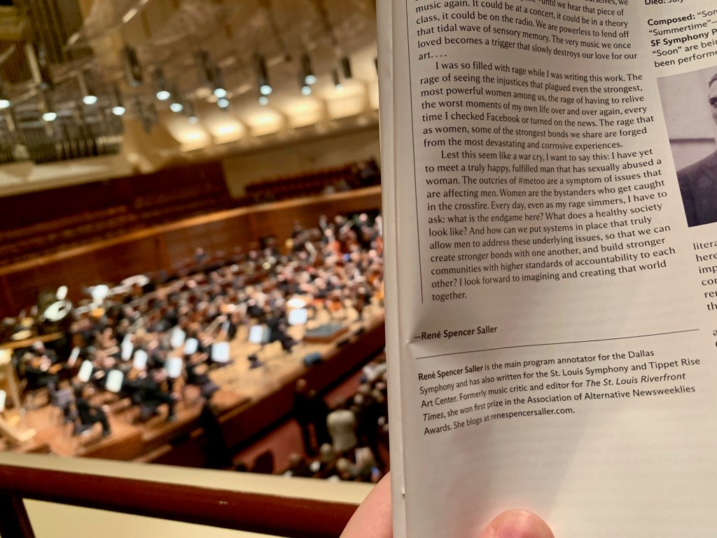 I wasn’t able to make the performance last night, but my friend and colleague Ben Pesetsky, the Associate Director of Editorial at the SF Symphony and a fine composer in his own right, was kind enough to take a photo of my byline in the paper version of the book and email it to me. (I will include the notes in a more legible format below the photo.)